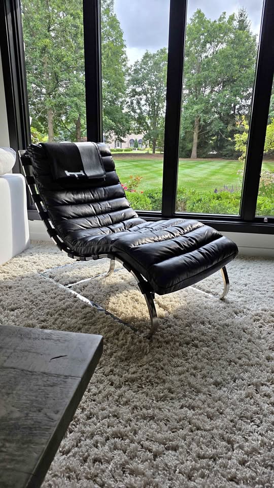 This is a stylish brown leather chaise lounge with a vintage look, featuring tufted cushions for comfort and a sleek metal frame. The curved design supports the natural contours of the body, providing a relaxing reclined seating experience. The leather upholstery adds warmth and sophistication, while the metal frame ensures sturdy support. The chaise is perfect for a living room or reading nook, combining both modern and classic design elements.