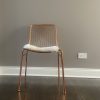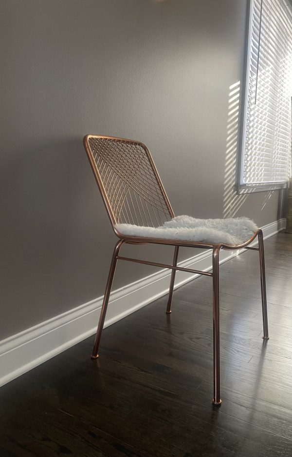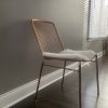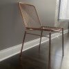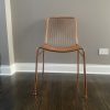 hot seat. Dare to dine up a notch. Modern metallic lacquers handmade iron frame with woven wire back expertly welded into a graphic linear pattern. Coated in brilliant brass, chair glamorously juxtaposes our wooden dining tables or adds shine to the home office. alpha brass chair is a CB2 exclusive.