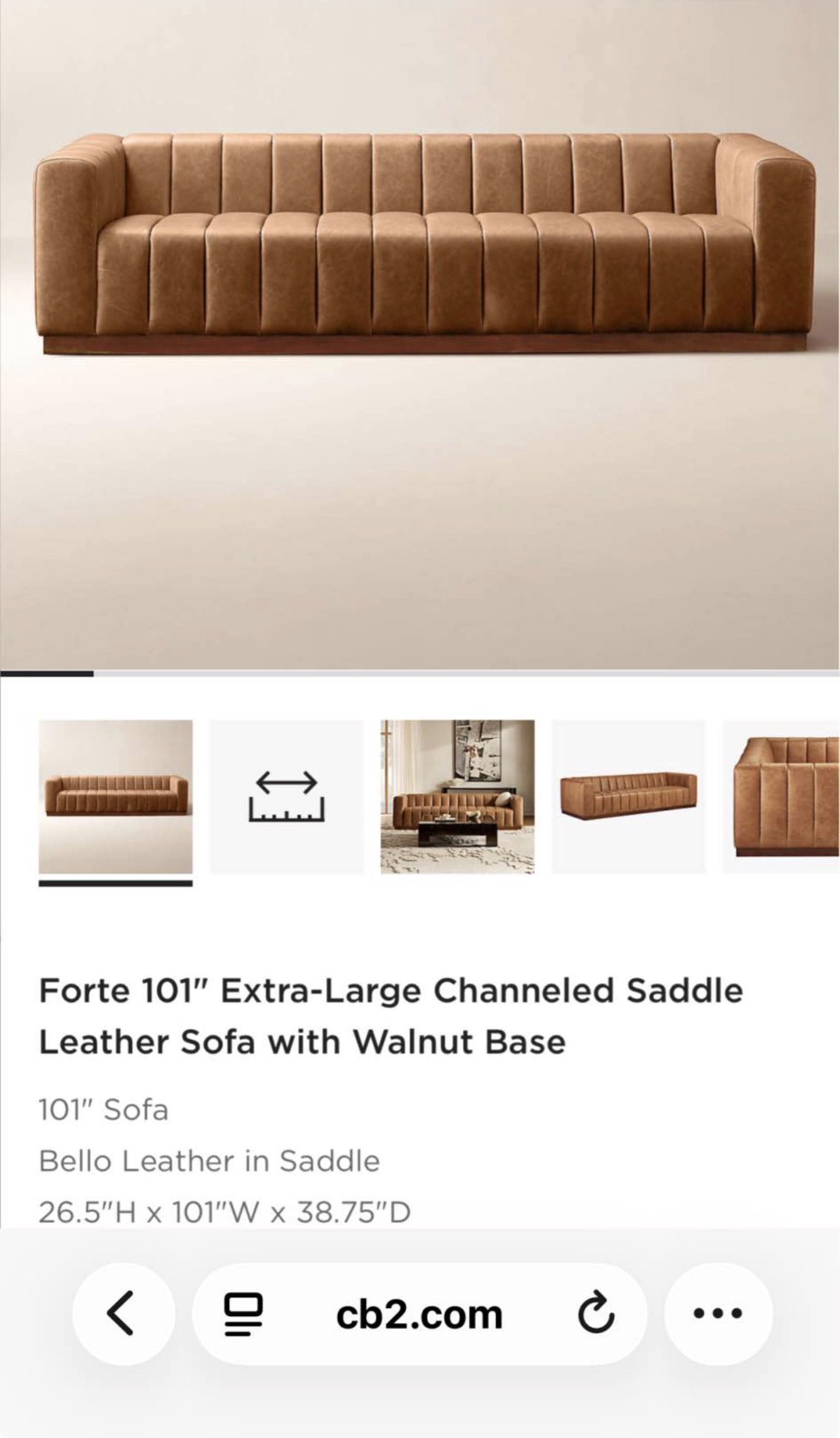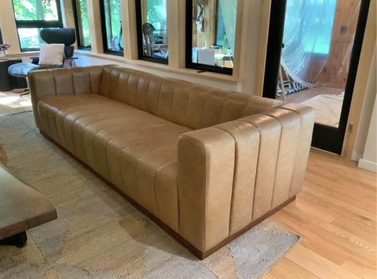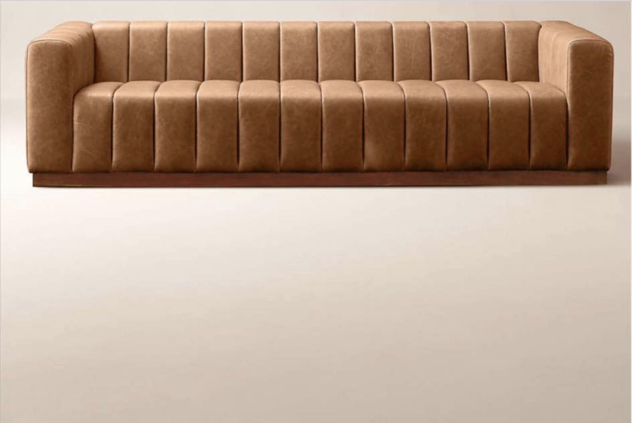 This extra-large sofa features a distinctive channeled design and is upholstered in rich saddle-colored Bello leather. It has a sturdy walnut base that adds warmth and elegance to the piece. The sofa’s wide arms and deep seating provide substantial comfort and a modern aesthetic. Its clean lines and premium materials make it a stylish addition to any contemporary living room.