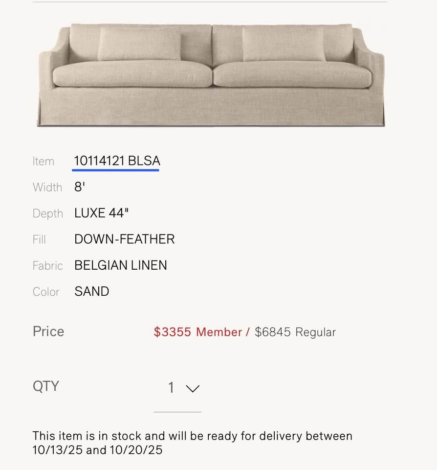 October 11, 2025 RESTORATION HARDWARE 2 Years Old Chicago, IL 96"W x 32"D x 38"H Beige Fabric Pre-owned - Like New: Free of defects and blemishes ,