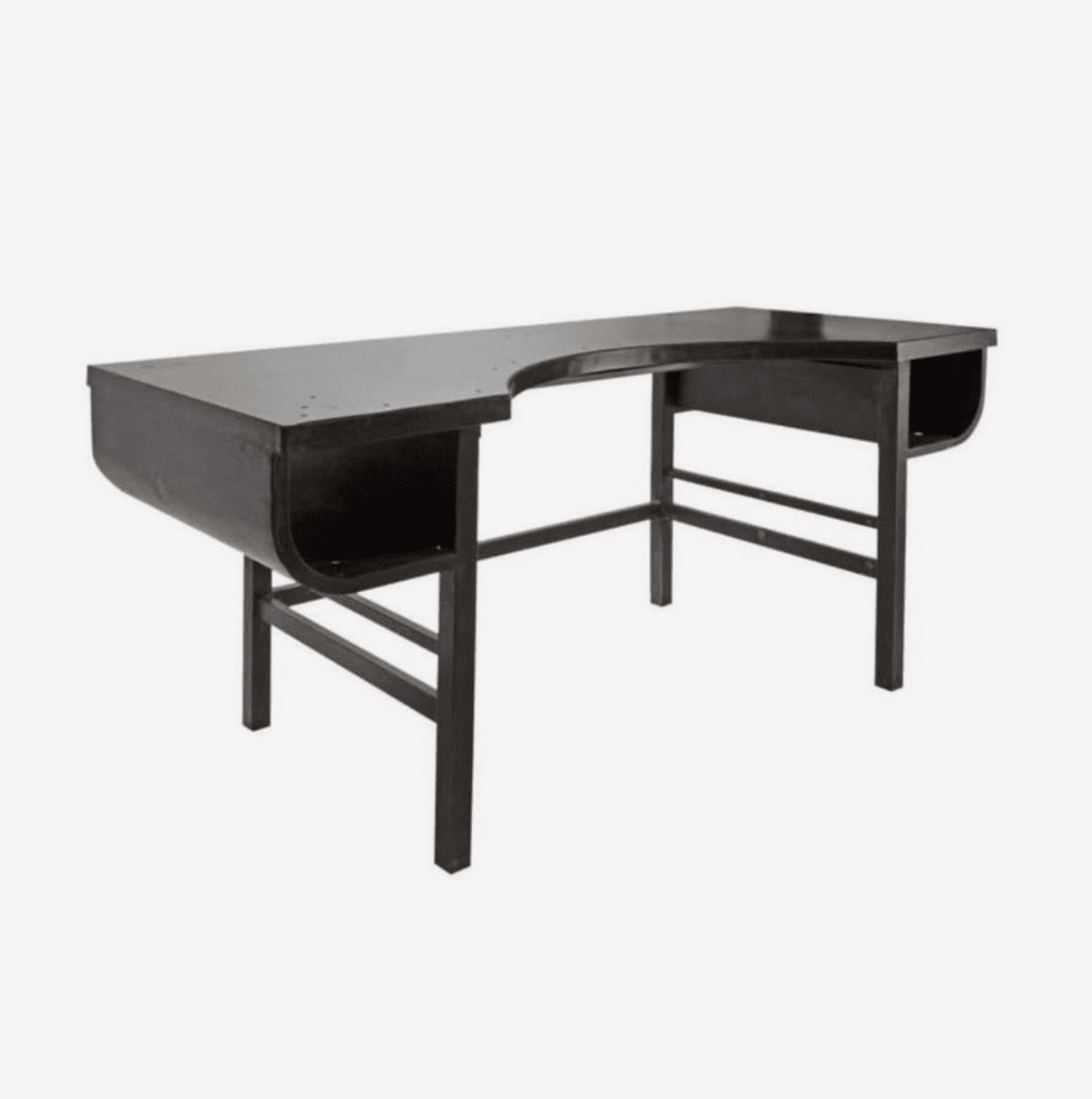 This vintage-style corner desk features a unique curved design with two built-in open storage shelves on each side. It has a sleek black finish that adds an elegant, timeless touch to any office or study space. The desk offers ample workspace with a curved indentation for comfortable seating. Its sturdy metal frame ensures durability while retaining a stylish, functional form.