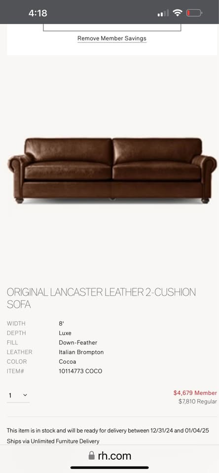 April 16, 2025 RESTORATION HARDWARE 1 Years Old Chicago, IL 96"W Italian Brompton cocoa Leather New ,