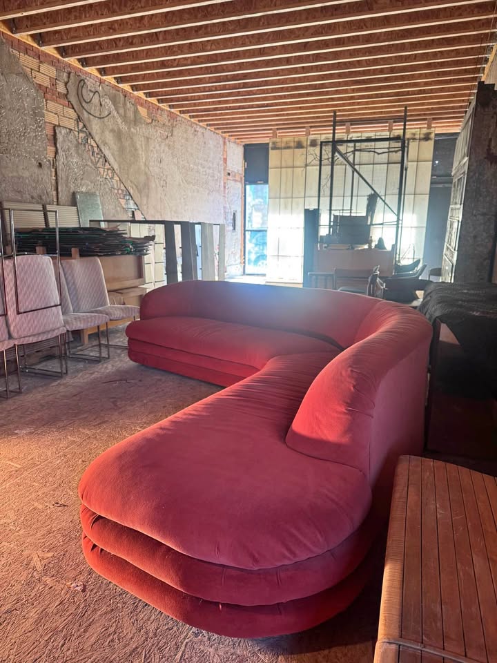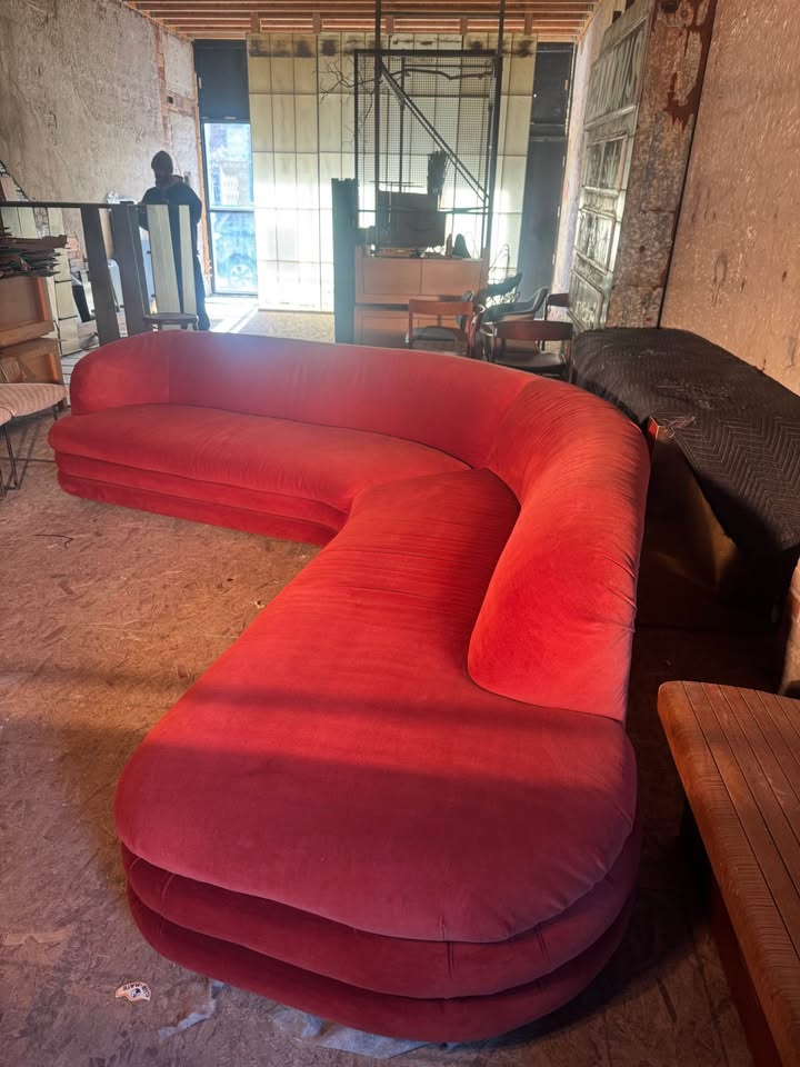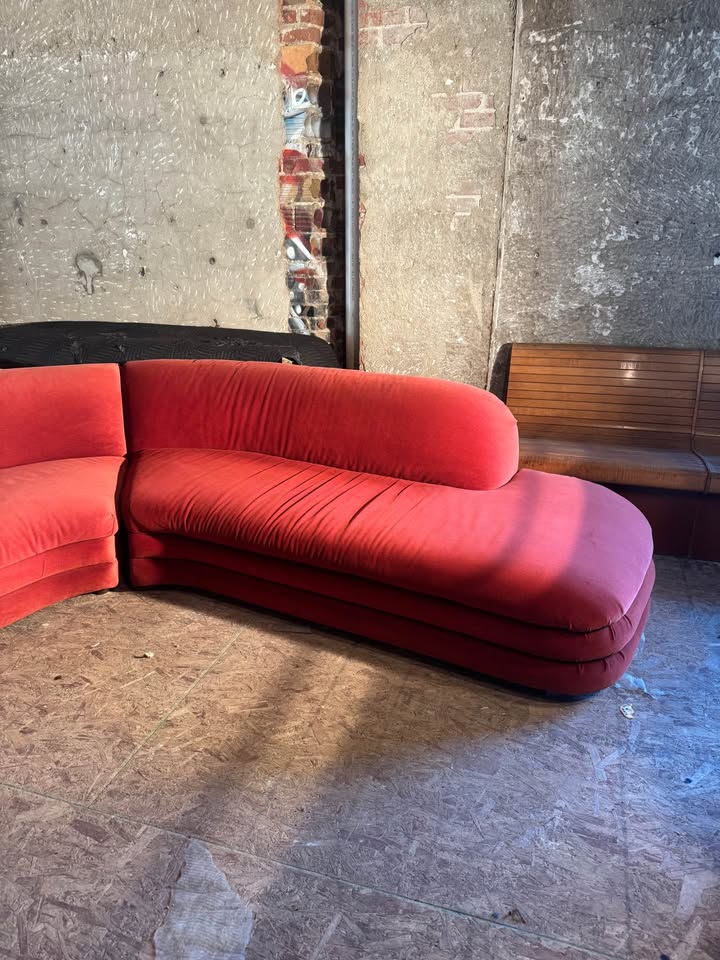 This is a large, curved sectional sofa upholstered in vibrant red velvet fabric. It features smooth, rounded edges and a plush seat and backrest, offering both style and comfort. The sofa’s dramatic curve and tiered base design add a unique visual appeal, making it ideal for modern or eclectic living spaces. Its deep seat depth makes it perfect for lounging and accommodating multiple people comfortably.