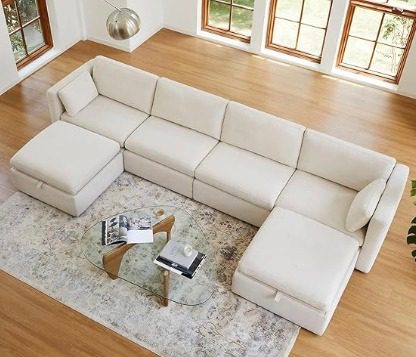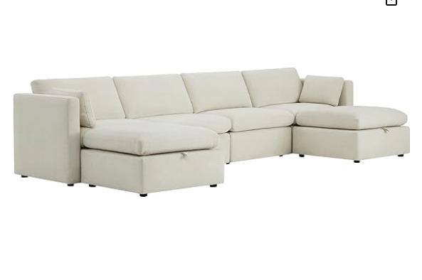 CompareBrand new linen color modular sectional sofa with storage in 2 ottomans. Took 3 pieces out of the box (last picture). Very comfortable and great quality, just doesn’t fit in our new space.