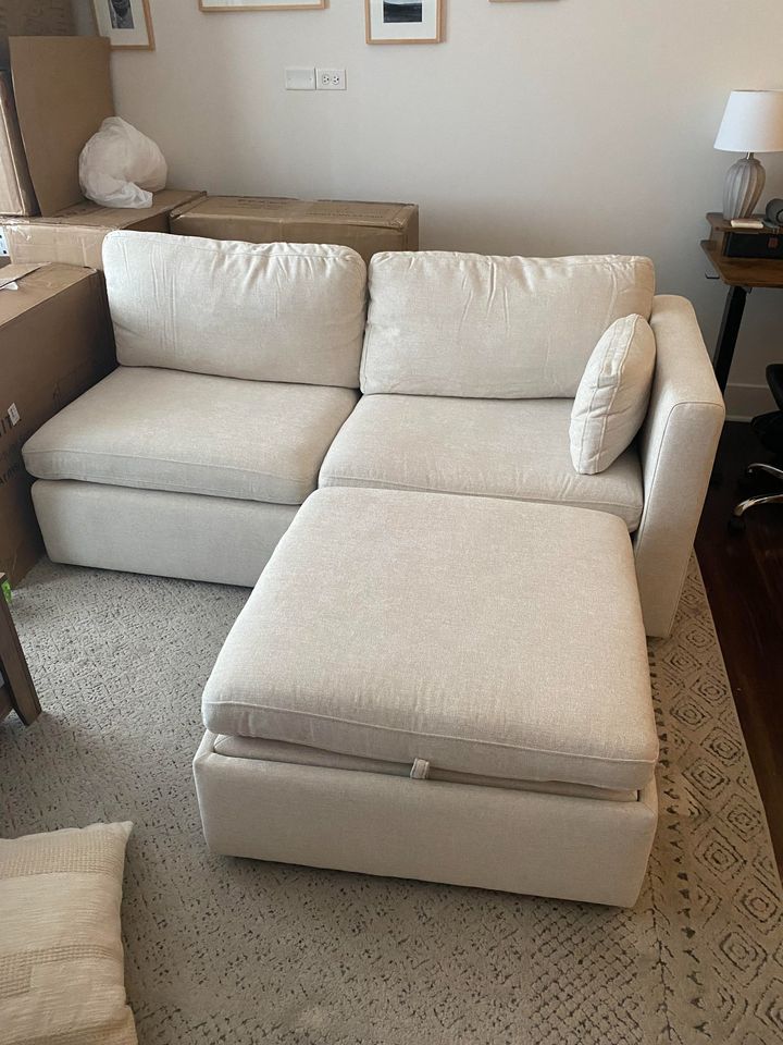 Brand new linen color modular sectional sofa with storage in 2 ottomans. Took 3 pieces out of the box (last picture). Very comfortable and great quality, just doesn’t fit in our new space.