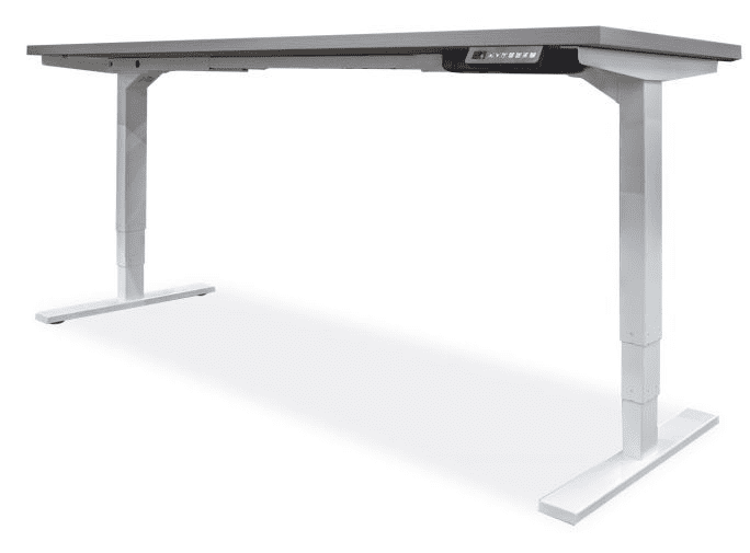 NEW OFCHite 30″W Adjustable Height Desk with Black, White or Silver Base consists of (1) black New OFC-HITE 2-motor, 2 or 3-stage, height-adjustable powered base shown with 30×60 work surface. Straight “T” base with 24″W legs. Comes with a programmable (4 presets) controller which allows height adjustment from 23.5″H to 49″H; (1) Laminate Surface.