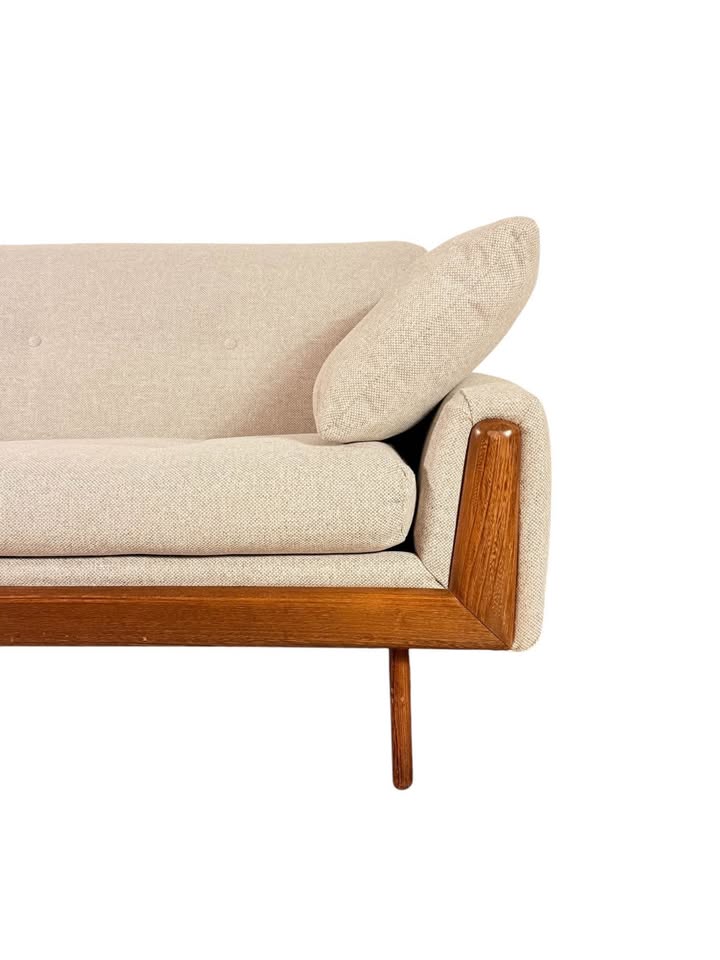 Meticulously reupholstered in a durable Crypton fabric, the tufted cushion offers a luxurious seating experience while being resistant to stains and wear— perfect for modern living. The sofa’s beautifully sculpted wood frame showcases the sleek lines and organic curves characteristic of mid-century design. Completing the look are two side pillows, providing added comfort and style.
