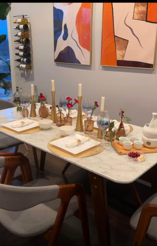 A sleek grey marble top set on a solid oak base, purchased in 2022. Refinished oak stain to darker walnut look. Original price price $1200 + walnut stain by professional wood finisher $500.