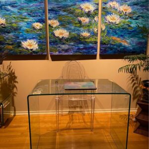 New Aura task chair, w/ black Air Grid seat back and black mesh seat. Built-in lumbar support. Pneumatic seat height adjustment. 2-to-1 synchro tilt control. Height adjustable angled arms. Black nylon base