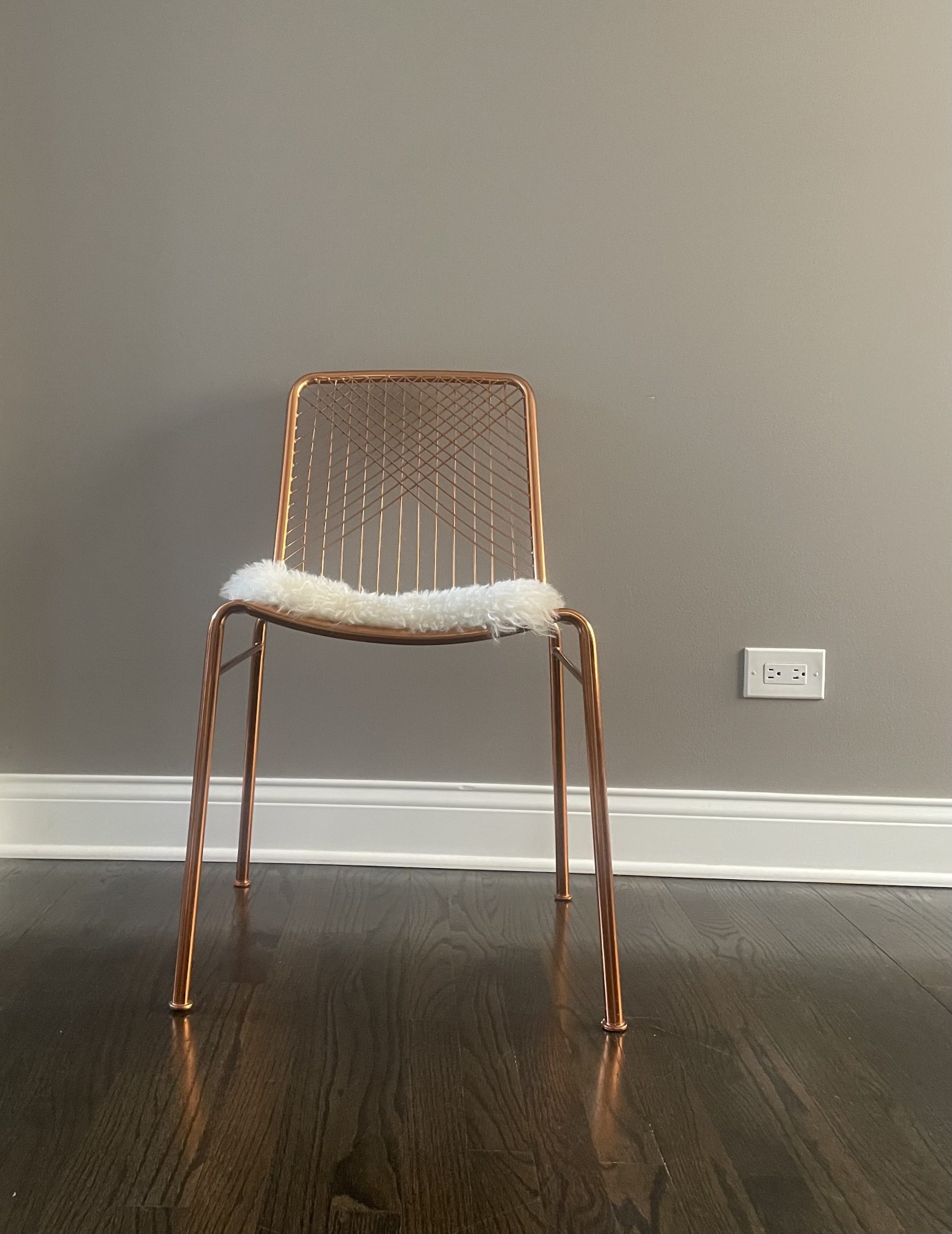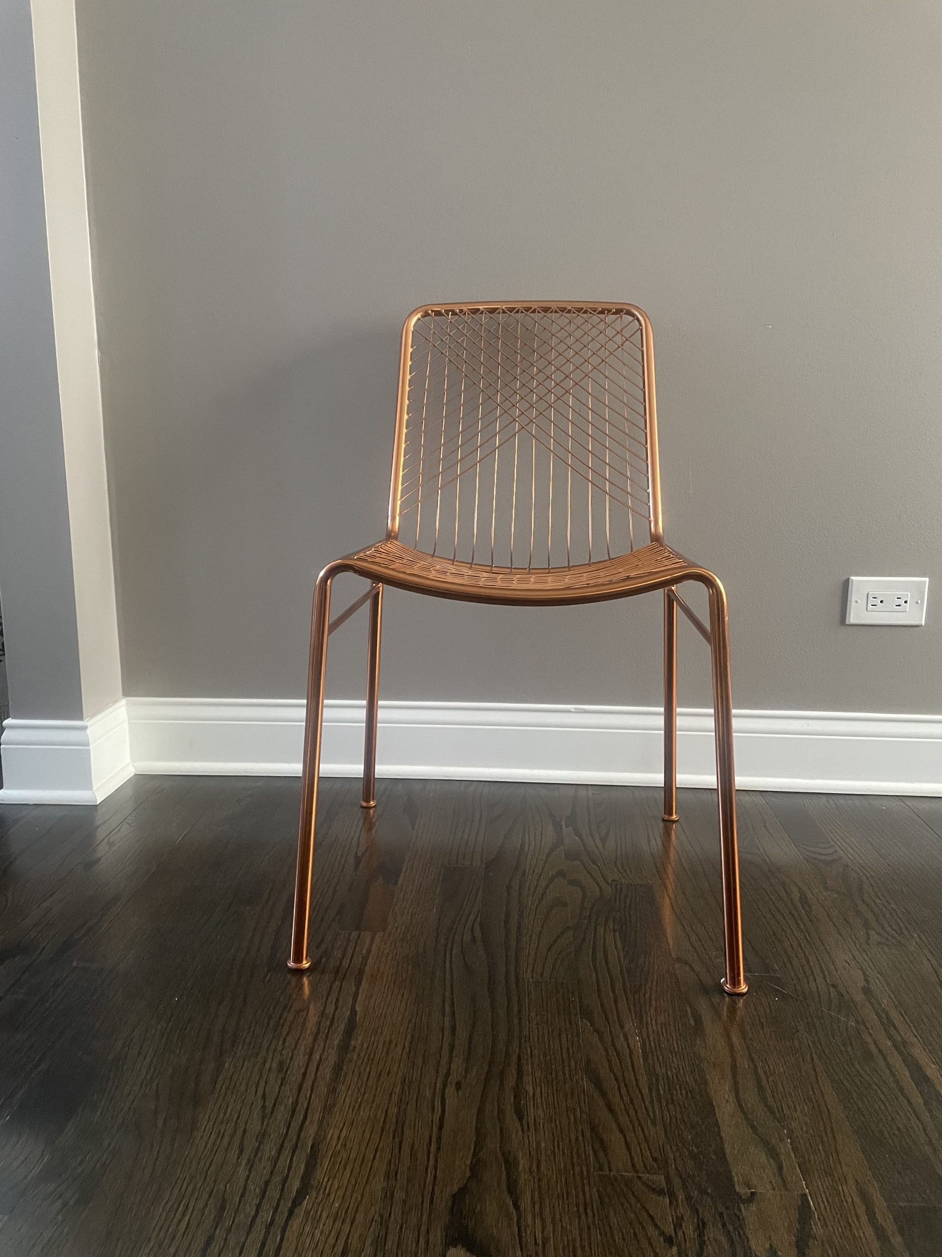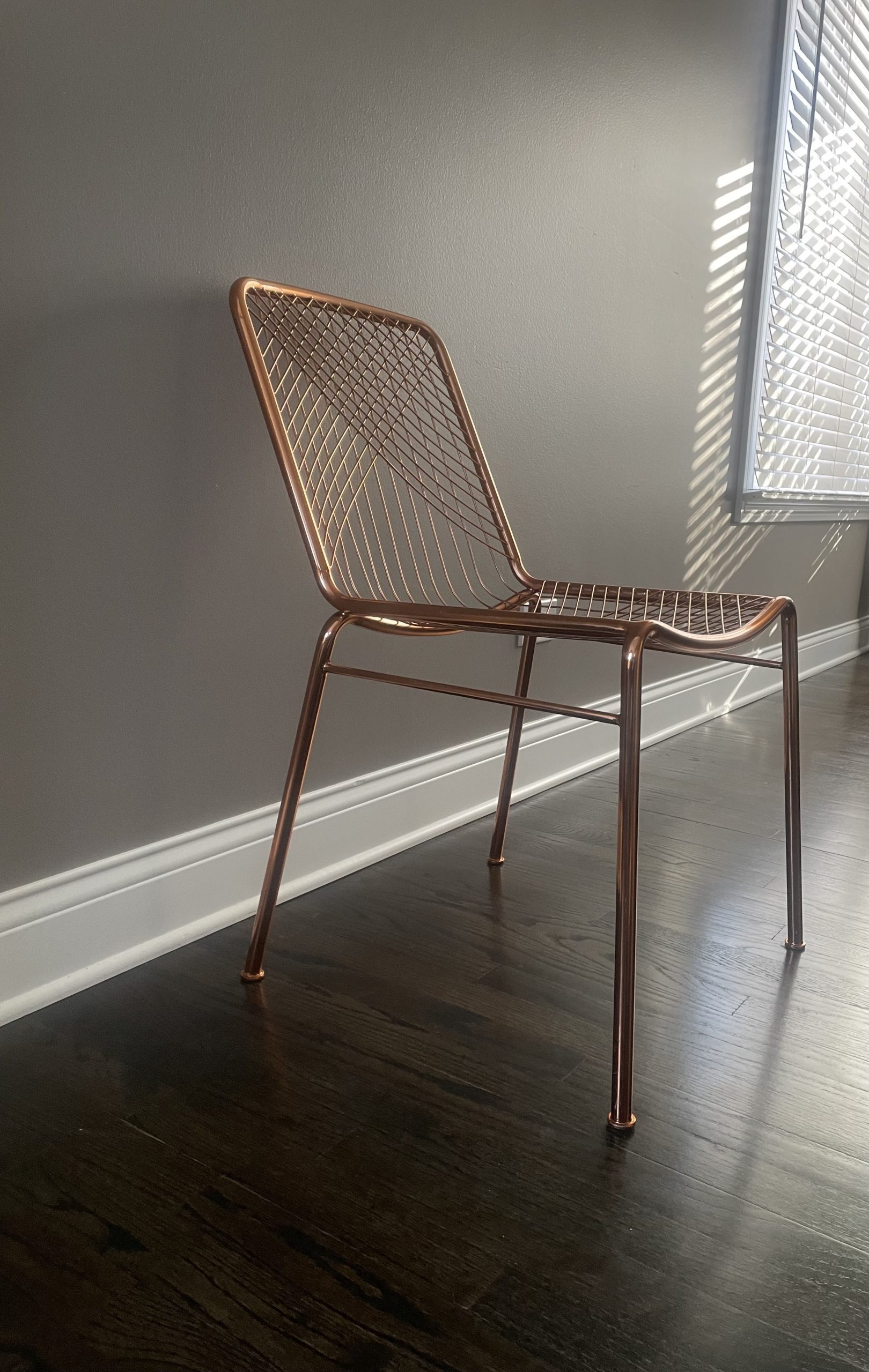 hot seat. Dare to dine up a notch. Modern metallic lacquers handmade iron frame with woven wire back expertly welded into a graphic linear pattern. Coated in brilliant brass, chair glamorously juxtaposes our wooden dining tables or adds shine to the home office. alpha brass chair is a CB2 exclusive.