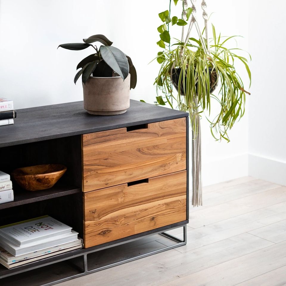 Multiple wood structure entertains with ease. Braced by a sleek iron frame, dark mango wood frames natural teak active with beautiful light and dark wood grains. Two open component middle cubbies are flanked by drawers on the right and a door (with two shelves) on the left, leaving lots of room to store audio/video gadgets. Finish with flatscreen on top.