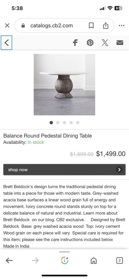 No longer available but description listed as :Brett Beldock’s design turns the traditional pedestal dining table into a piece for those with modern taste. Grey-washed acacia base surfaces a linear wood grain full of energy and movement. Ivory concrete round stands sturdy on top for a delicate balance of natural and industrial. Learn more about Brett Beldock on our blog. CB2 exclusive. Designed by Brett Beldock Base: grey washed acacia wood Top: ivory cement.