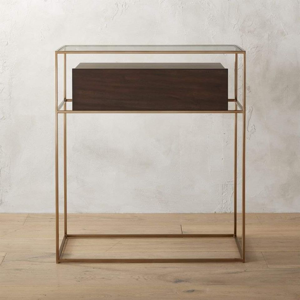 Very sleek profile, elegant brass frame with walnut wood drawer and glass top. It makes a great vanity table and is beautiful in an entryway.