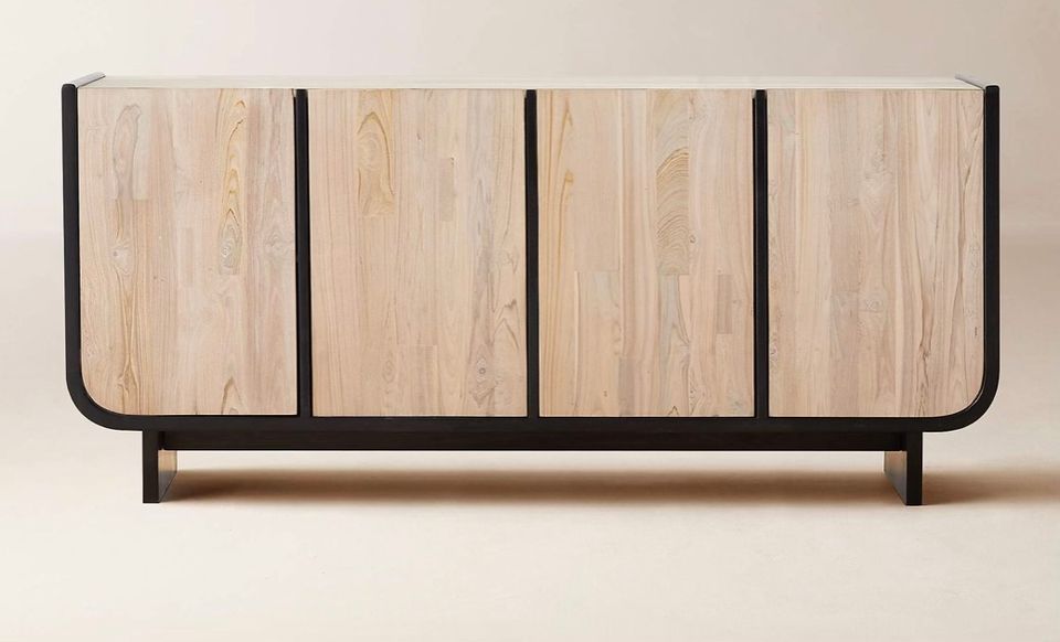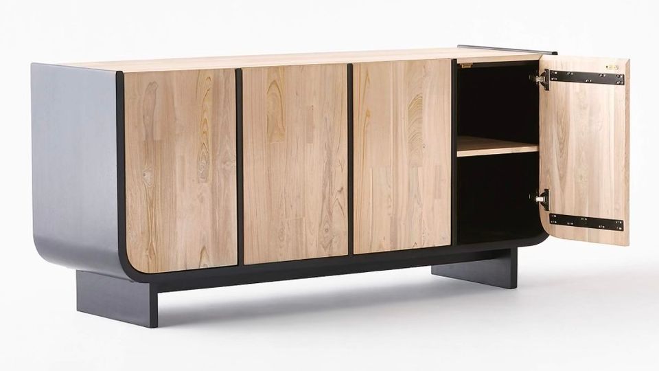 Repurposed white-washed teak wood makes a handsome credenza by Jannis Ellenberger, with a blackened mango wood frame for added interest and design edge. Shelves inside are adjustable to suit your needs while discreet cord management keeps it neat. Learn about Jannis Ellenberger on our blog. CB2 exclusive.