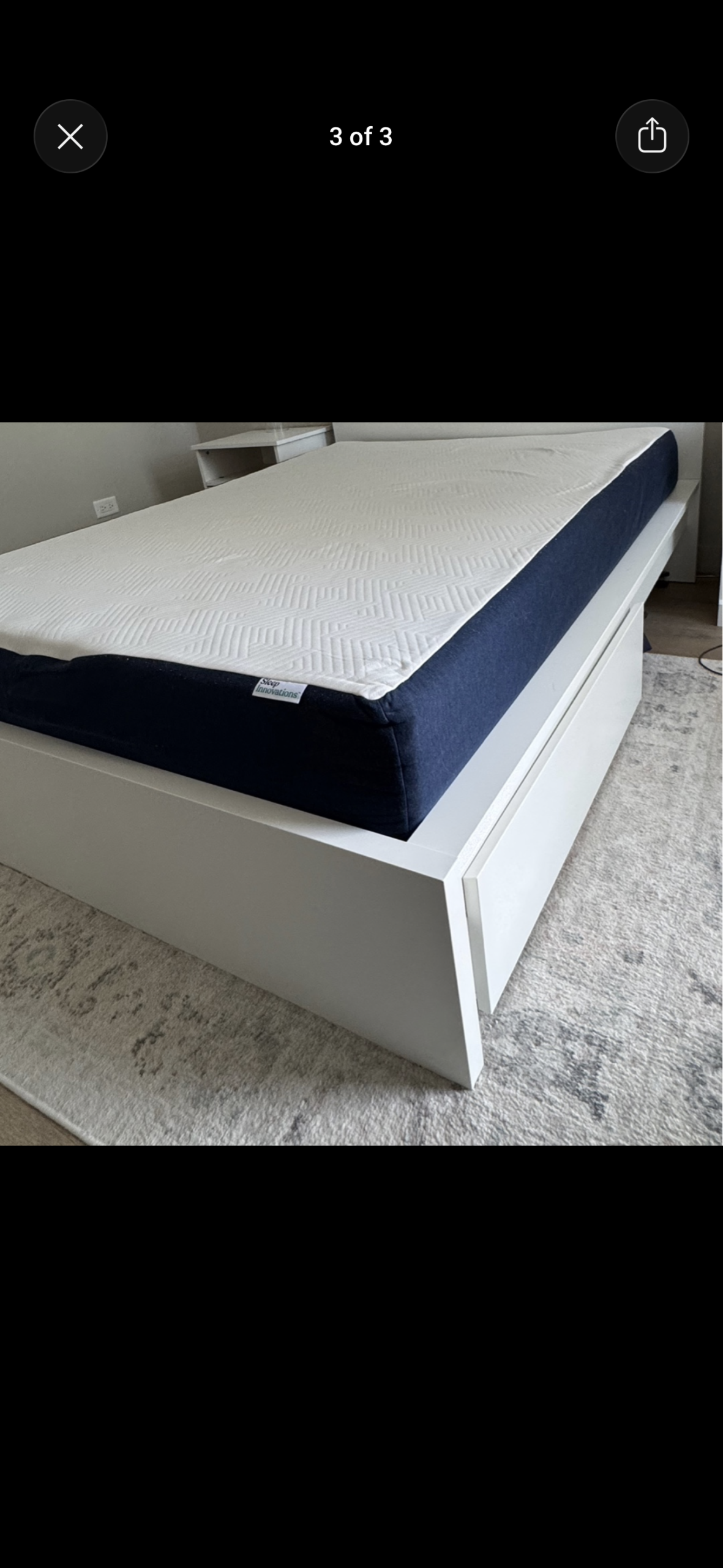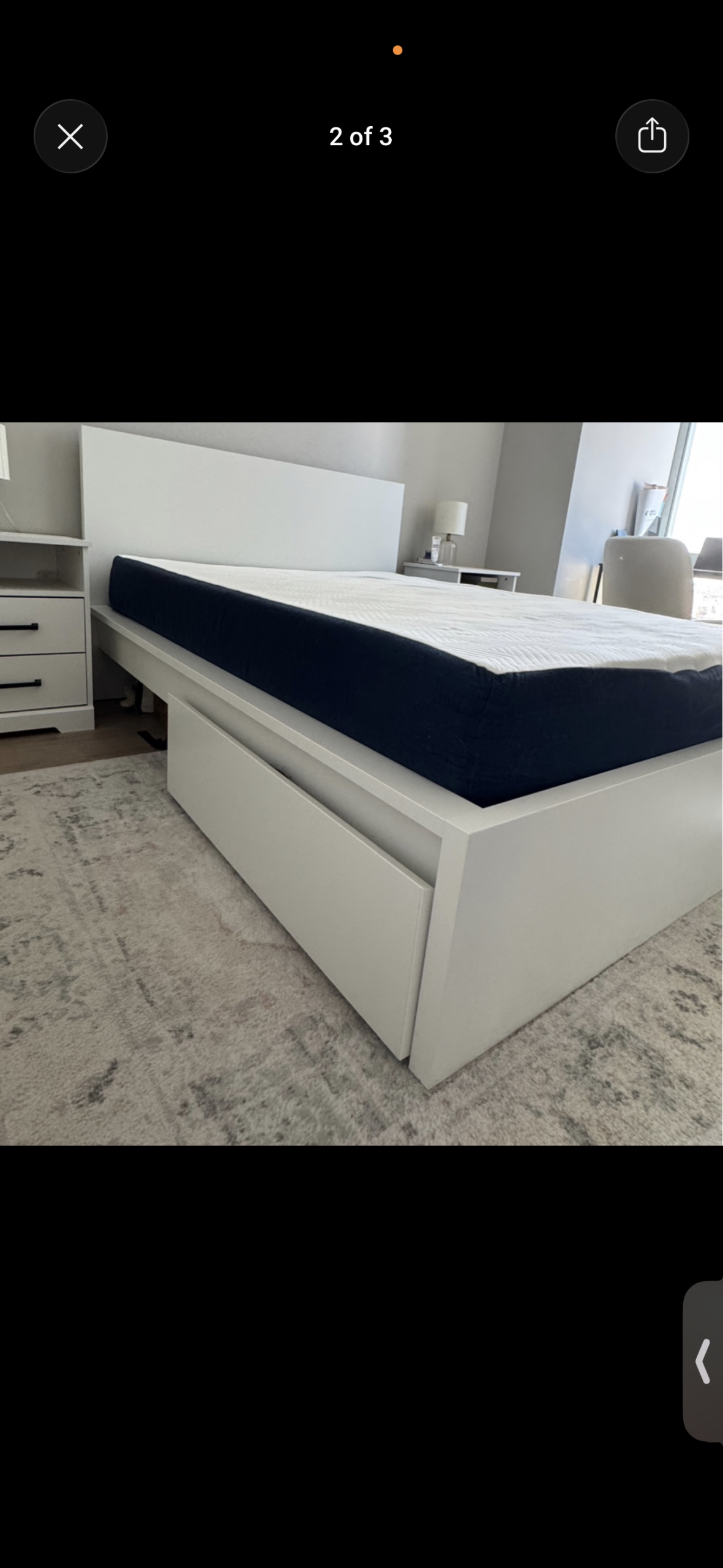 This modern white platform bed features a sleek, minimalist design with a solid headboard and built-in storage drawers at the foot of the bed. Crafted from wood with a smooth white finish, this bed offers both style and functionality, perfect for a contemporary bedroom. The mattress sits flush with the bed frame, complementing the clean lines. The furniture is in pre-owned, very good condition, with minor blemishes that are hardly noticeable.