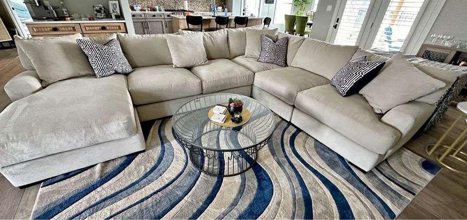The most comfortable sofa ever! We bought this at Macys, for a room that we never used while we lived in AZ. It is a year and 1/2 old and in PRISTINE condition. The fabric is corduroy. The blue pillows are NOT included.