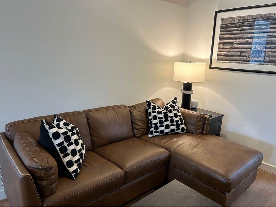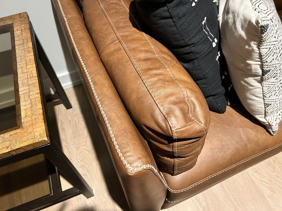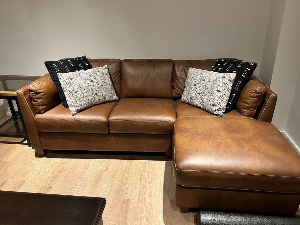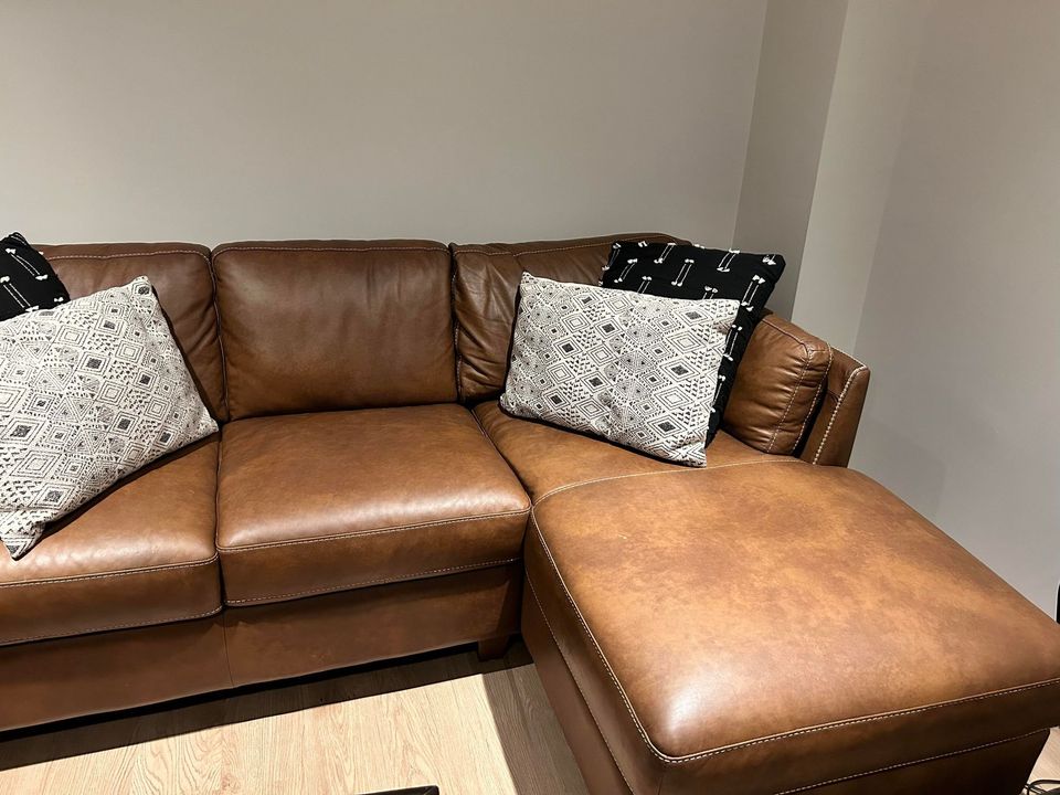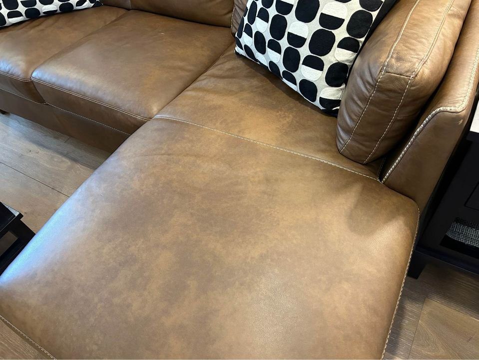 Cognac leather couch with chaise. White top stitching. Zip out cushions. Six months old.