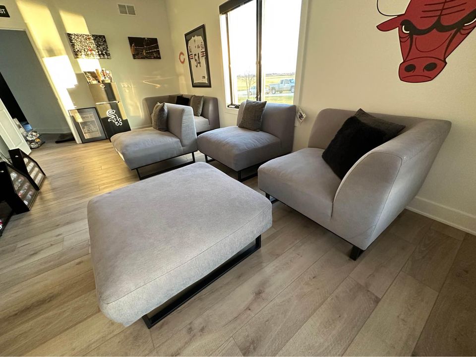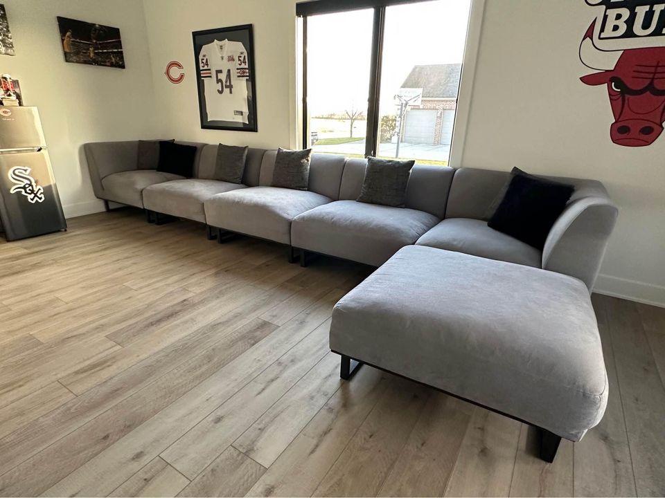 Scott Living Sectional by Coaster in a grey micro velvet with black metal legs. Comes with two corner sections, three armless sections and an ottoman.