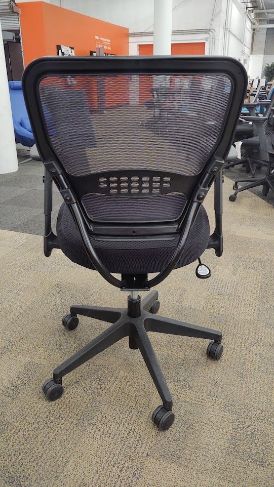 New OFC Aura task chair, w/ black Air Grid seat back and black mesh seat. Built-in lumbar support. Pneumatic seat height adjustment. 2-to-1 synchro tilt control. Height adjustable angled arms. Black nylon base.