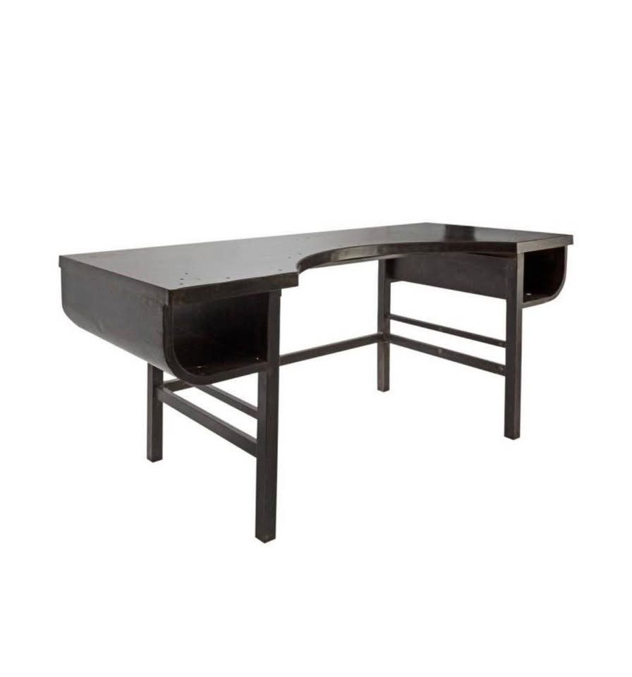 This vintage-style corner desk features a unique curved design with two built-in open storage shelves on each side. It has a sleek black finish that adds an elegant, timeless touch to any office or study space. The desk offers ample workspace with a curved indentation for comfortable seating. Its sturdy metal frame ensures durability while retaining a stylish, functional form.