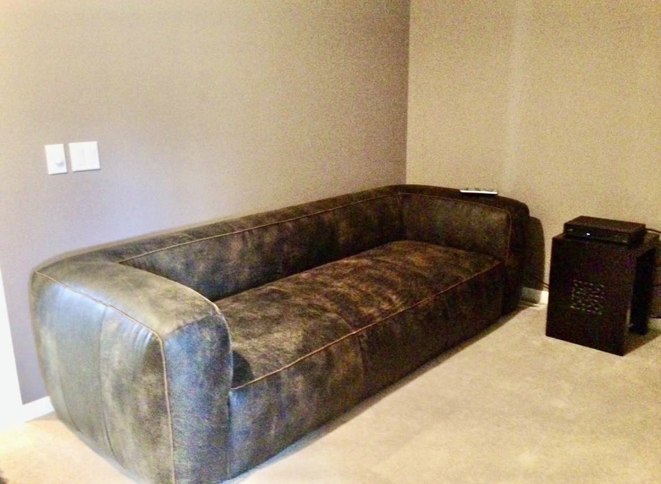 This modern sofa features a plush, cushioned design with rounded arms and a durable dark brown leather upholstery. Its sleek, minimal silhouette offers comfort and style, making it a great focal point for any living room. The leather material provides a rich texture and easy maintenance, suitable for contemporary decor.