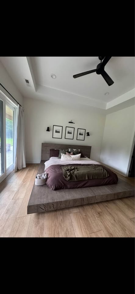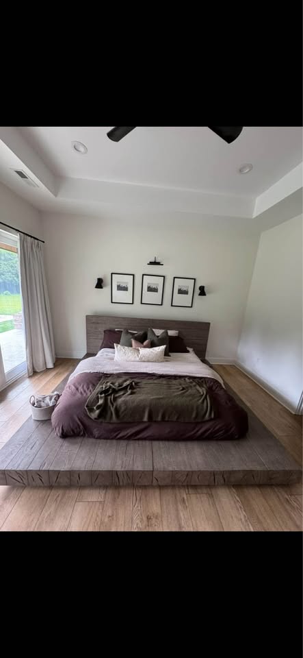 A modern platform bed with a simple, clean-lined wooden headboard and frame. The bed has a low profile with a solid wood construction featuring a natural wood finish. It is complemented by neutral bedding with a cozy throw blanket, highlighting its contemporary and minimalist aesthetic ideal for a stylish bedroom.