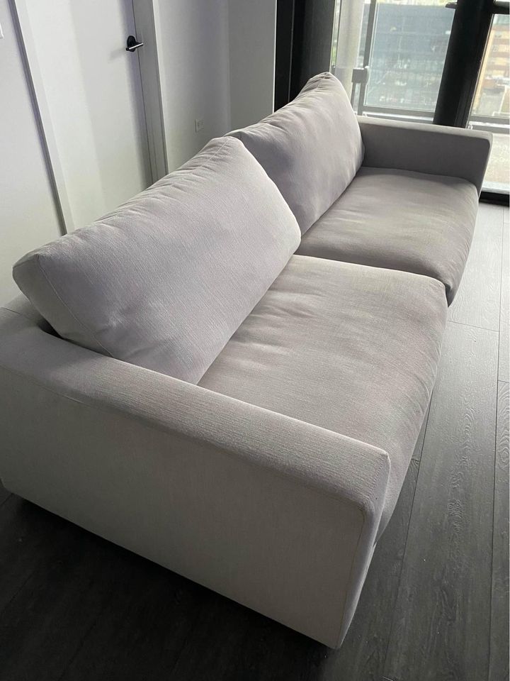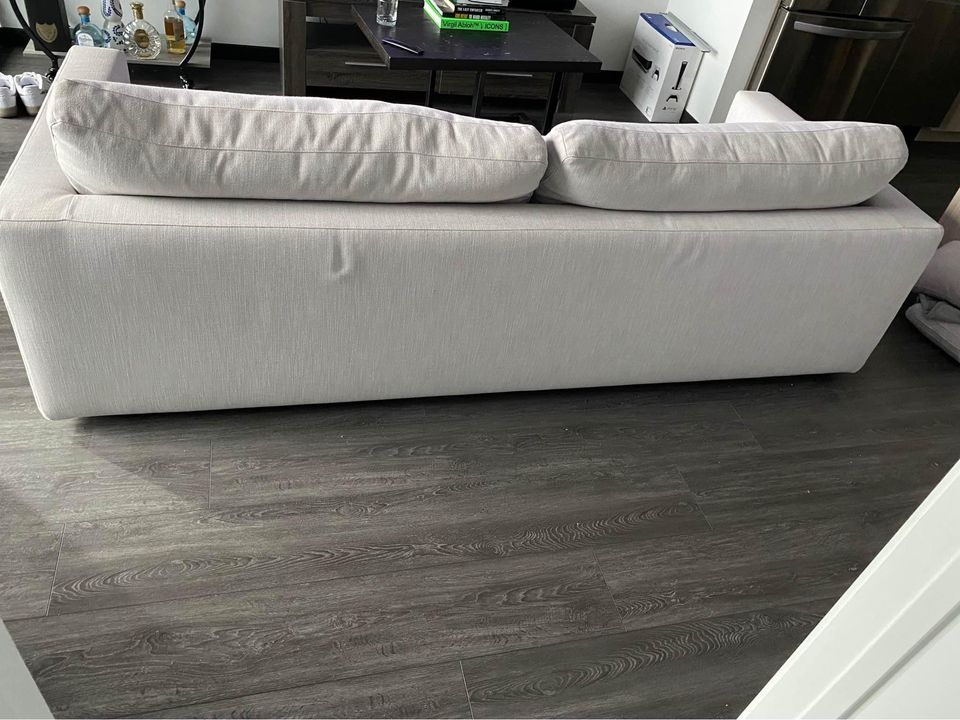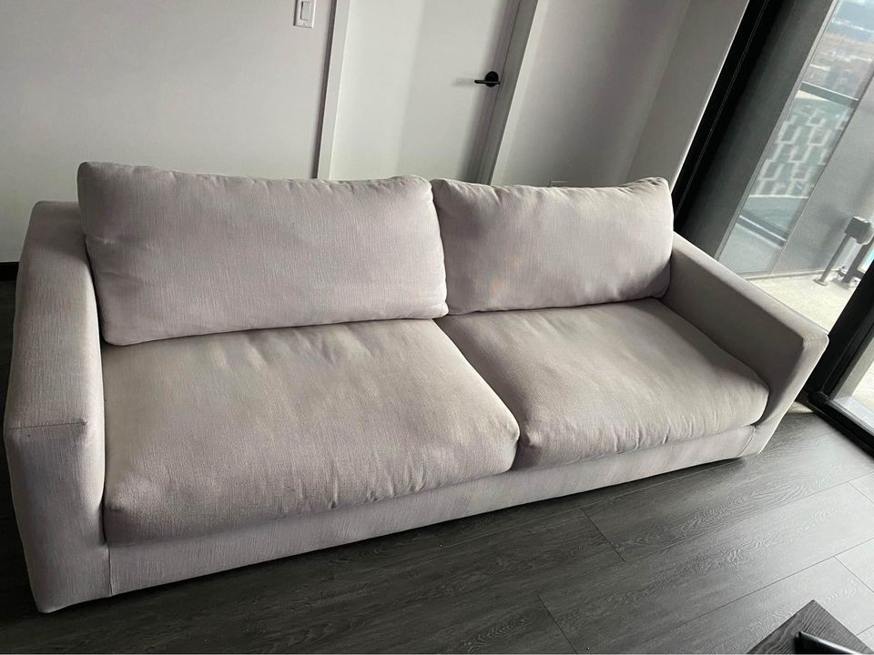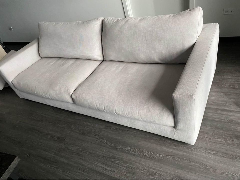 I bought this Sofa from Restoration Hardware a year ago in July and now I’m getting a new couch for my new place. I paid a little over 6k for the sofa. High end Sofa and it’s in very great condition. The Fabric is linen. If you know anything about RH their warranties are endless and they come and maintenance the linen and anything you need on the couch whenever you need. Lifetime warranty pretty much. The Sofa is a Cream/Beige color. Thanks