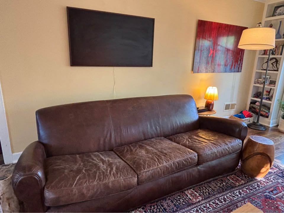 We really don’t have the right space for this sofa. It’s in very good condition with very little use (it’s underneath our tv!). No rips to the leather. Measures 96W, 40D and 33H. Leather: vintage. Color: Cigar. Fill: down-feather.