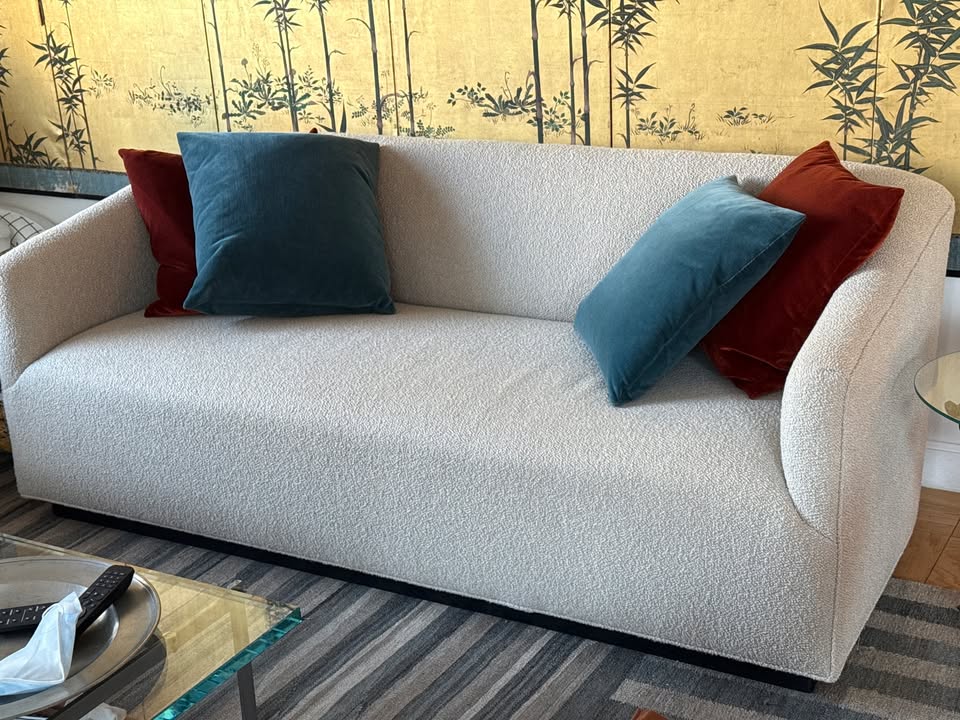 A modern sofa with a smooth, curved back and armrests that seamlessly blend into the design. Upholstered in a soft beige fabric with a subtle textured weave, offering a cozy and inviting seating option. The sofa features low-profile black base supports, enhancing its contemporary aesthetic. Perfect for living rooms aiming for a clean and minimalist look while maintaining comfort and style.