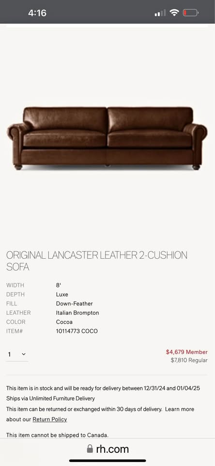 April 16, 2025 RESTORATION HARDWARE 1 Years Old Chicago, IL 96"W Italian Brompton cocoa Leather New ,