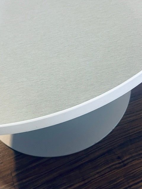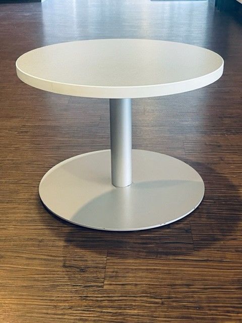 ComparePre-owned Steelcase 24″ Enea Occasional Table. Finishes are – Grey surface with a White edge and a Silver base. 17 1/4″ Table Height