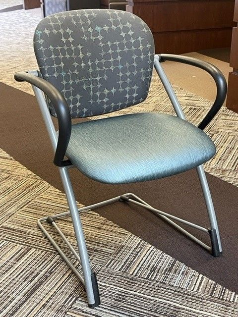 Pre-owned Steelcasde Ally Multi Purposed Side Chair. Grey pattern back with a blue vinyl seat and a Silver Sled base frame. Features: – Stackable sled base – Flex Back – Arms. Dimension: 24 1/2″ D x 24″ W x 34″ H
