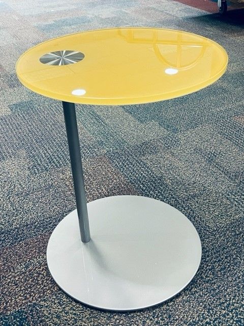 ComparePre-owned Steelcase Await Table. Silver powder coated table base with a Yellow Glass top. Dimensions: 15 3/4″ x 19″ H