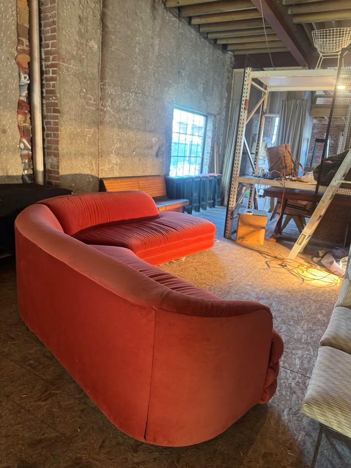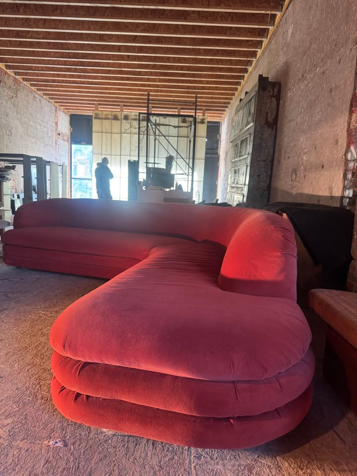 This is a large, curved sectional sofa upholstered in vibrant red velvet fabric. It features smooth, rounded edges and a plush seat and backrest, offering both style and comfort. The sofa’s dramatic curve and tiered base design add a unique visual appeal, making it ideal for modern or eclectic living spaces. Its deep seat depth makes it perfect for lounging and accommodating multiple people comfortably.
