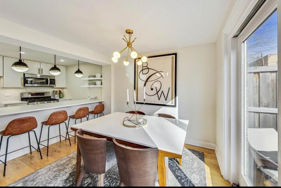 West Elm mid-century modern dining table with white table top and seating up to 6. Great focus point for family meals and gatherings. Reason for selling is moving and changing style to match new home.